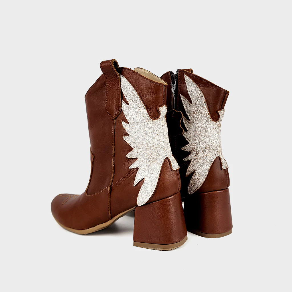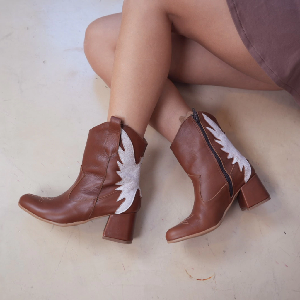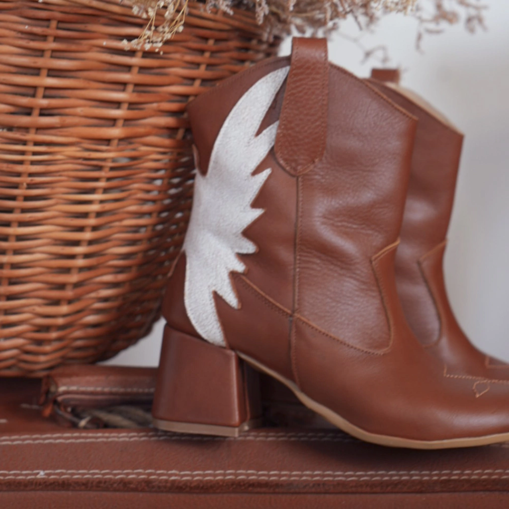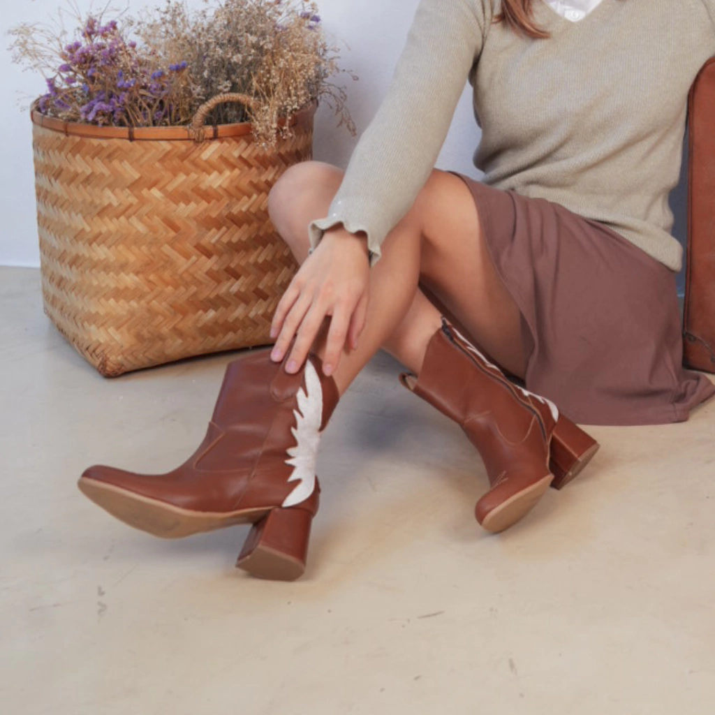 Hermosas botas estilo texanas de mediacaña. Con taco cómodo y terminación semi en punta. tiene un hermoso diseño en la parte de atrás en blanco desgastado y puntera con diseño cosido. Tiene cierre lateral interno que las hace súper fácil de calzar. ¡Las vas a amar!