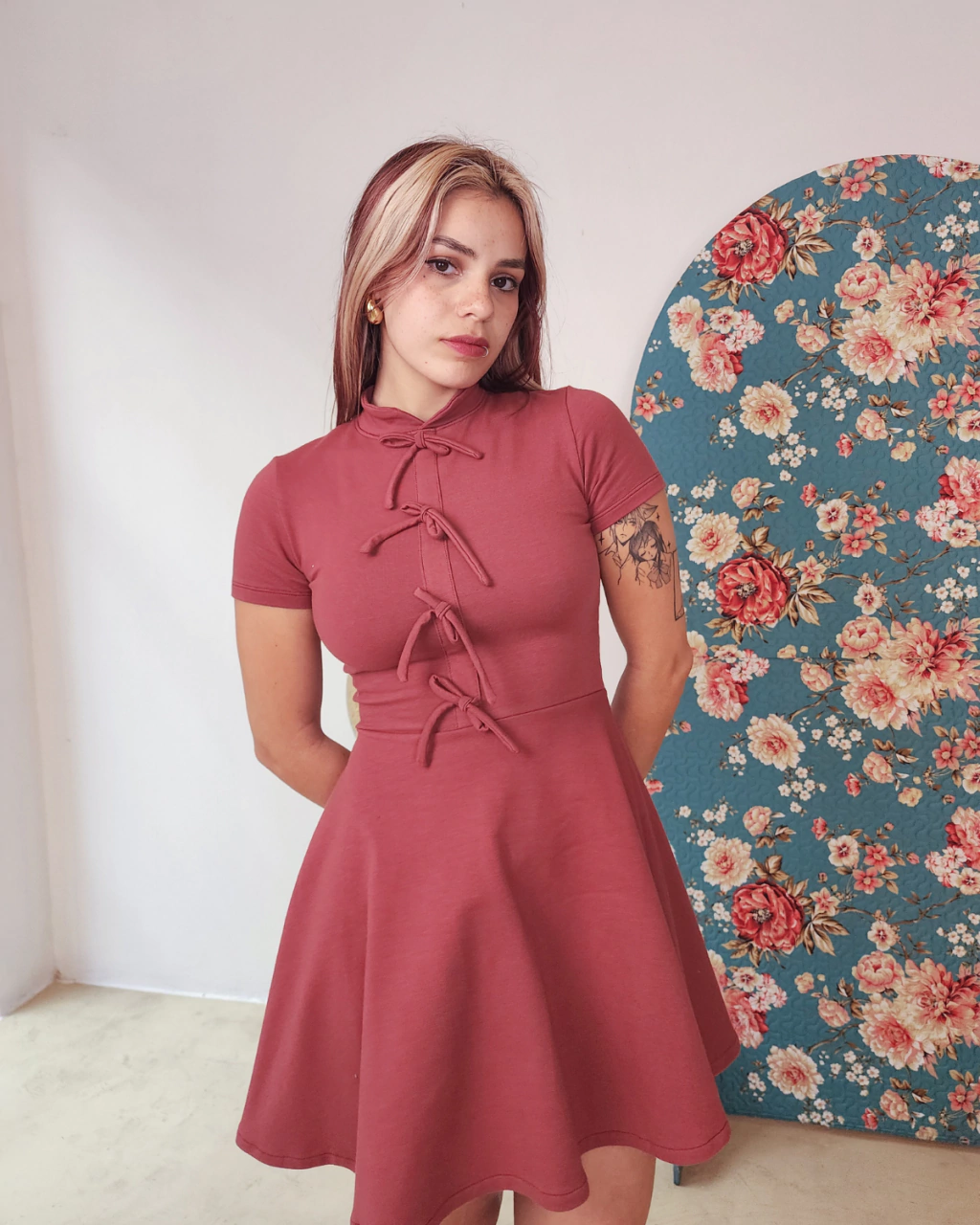 Súper romántico con estilo vintage. Vestido corto con pollera evasé, ajustado hasta la cintura, con cuello Mao y moños a tono en el frente.